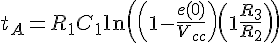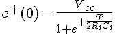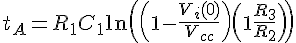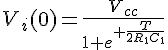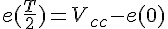 En faisant l'hypothèse que l'AOP est de type "rail-to-rail" et alimenté asymétriquement (soit Vs min=0V et Vs max=+Vcc), et que la tension d'entrée est un signal carré 0V/+Vcc de rapport cyclique 50% (puisque Vi moyen=2,5V), on a, en fixant t=0 sur le front montant de Vi: