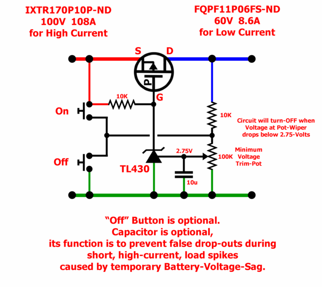 Au cas ou je ne trouverai pas, j'ai pensé à y intégrer un système anti décharge profonde et je suis tombé sur ce schéma: