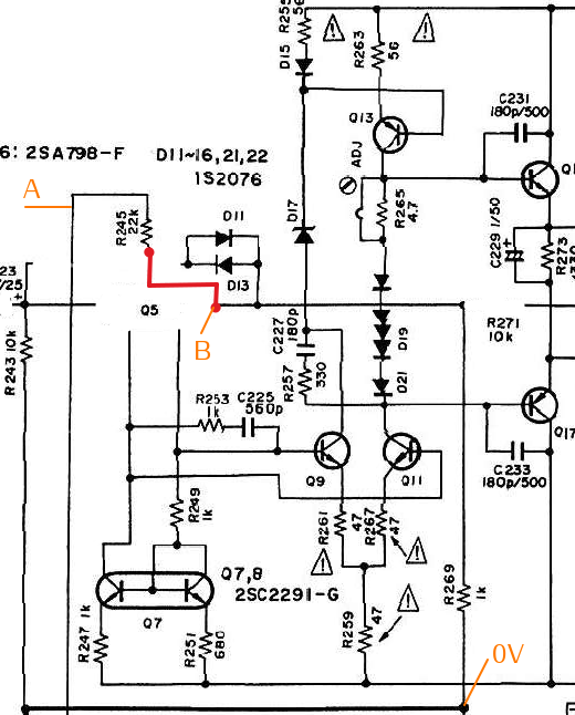 Tu cables Q5, Q7, R245, R249, R247,R251 en les isolant du reste. Donc exit Q9, Q11, R271, R253 ou C225 (un seul des 2 suffit). D11 et D13 restent.