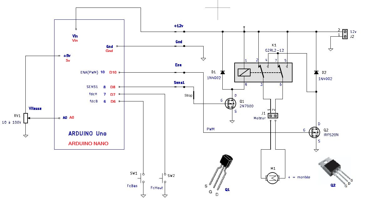 J'ai fait le proto, fonctionne impeccable..Code:/* essai telepherique 30-09-2025 avec reglage vitesse par potentiometre a chaque montee ou descente petite pause 50mS le temps que le relais colle ou décolle broches Arduino: pin 6: fin de course Haut pin 7: fin de course Bas pin 8: marche avant-montée (IN1A d'un L298 ou collage relais version relais) pin 9: marche arriere-descente (IN2A d'un L298 ou non utilisé version relais) pin 10: enable moteur (ENA d'un L298 ou commande Q2 version relais) */ //----------------------------------- #define fdcH 6 // entrée fin de cource Haut 0v actif #define fdcB 7 // entrée Fin de course Bas 0v actif #define out1 8 // sortie sens 1 moteur (avant) #define out2 9 // sortie sens 2 moteur (arrière) #define ena 10 // sortie Enable moteur (PWM) 5v actif int speed = 5; // vitesse acceleration, ralentissement 1=255mS 4=1sec // si speed est à 0, arret net moteur des le fin de course int pause = 3000; // temps de pause arret en mS int vitesse = 255; // vitesse 0 a 255 int vitmin = 20; // vitesse min 0 a 255 int pot = A0; // pt milieu potentiometre sur entrée A0 //----------------------------------- void setup() { pinMode(fdcH, INPUT_PULLUP); // rappel au +5v pinMode(fdcB, INPUT_PULLUP); pinMode(out1, OUTPUT); pinMode(out2, OUTPUT); pinMode(ena, OUTPUT); Serial.begin(9600); } //----------------------------------- void loop() { // boucle sans fin if (digitalRead(fdcH)) { // si en bas ou en cours de trajet Readvitesse(); Montee(); delay(pause); // delai arret en Haut (en mS) } Readvitesse(); Descente(); delay(pause); // delai arret en Bas (en mS) } //----------------------------------- void Montee() { // montee, marche avant, sens1 digitalWrite(out1, HIGH); // sens1 niveau haut digitalWrite(out2, LOW); // sens2 niveau bas delay(50); // delai collage relais Accelere(); while(digitalRead(fdcH)); // On attend fdcH a 0 Ralentit(); // arret progressif du moteur en Haut } //----------------------------------- void Descente() { // descente, marche arrière, sens2 digitalWrite(out1, LOW); // sens1 niveau bas digitalWrite(out2, HIGH); // sens2 niveau haut delay(50); // delai decollage relais Accelere(); while(digitalRead(fdcB)); // On attend fdcB a 0 Ralentit(); // arret progressif du moteur en Bas } //----------------------------------- void Accelere() { // demarrage progressif du moteur for (int pwm = 0; pwm <= vitesse; pwm++) { analogWrite(ena, pwm); delay(speed); //Serial.println(pwm); } } //----------------------------------- void Ralentit() { // arret progressif du moteur for (int pwm = vitesse; pwm >= 0; pwm--) { analogWrite(ena, pwm); delay(speed); //Serial.println(pwm); } } //----------------------------------- void Readvitesse() { // lecture potentiometre 0 a 1023 /4 vitesse= analogRead(pot) /4; //vitesse = 0 a 255 if (vitesse < vitmin) { // eviter vitesse=0 vitesse= vitmin; } }