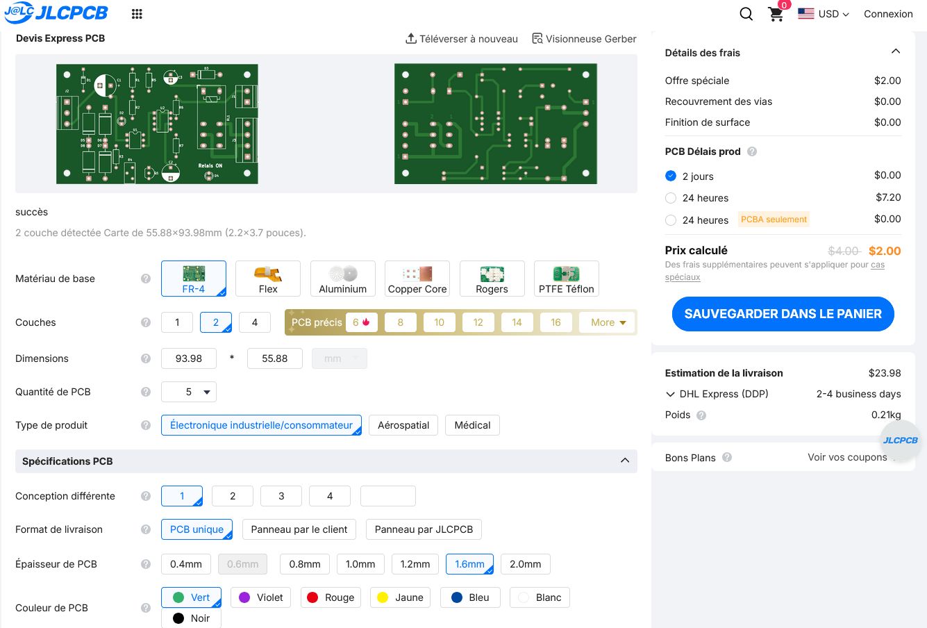 aperçu commande JLPCB https://cart.jlcpcb.com/fr/quote?plateType=1