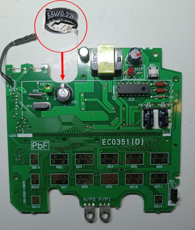 Je voudrais remplacer un supercondensateur (super-capacité) mémoire 5,5V 0,22F car s’il y a une coupure électrique la mémoire ne tient que 2h, et je souhaiterais que la durée de la mémoire soit augmentée.