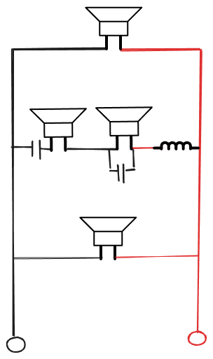 Côté médiums 1 self puis un médium avec un condensateur en parallèle, puis un second médium, puis un second condensateur en série