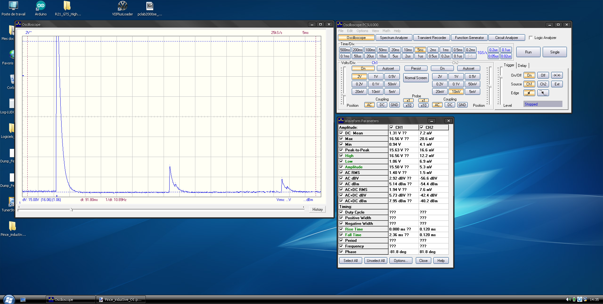 Mais je bloque ensuite pour l'exploitation de ce signal avant l'envoi sur l'entrée de l'arduino. En effet l'amplitude du signal dépasse 16V avec il me semble une composante continue et j'ai des petits pics de tensions induits par les autres fils de bougies à proximités.