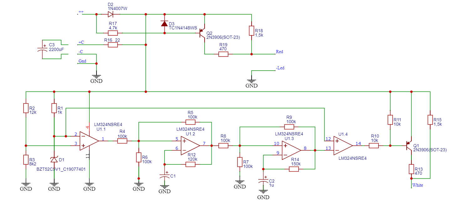 - U4 inverse la sortie de U2 pour commander le PNP et activer R14, comme prévu dans le montage d'origine.