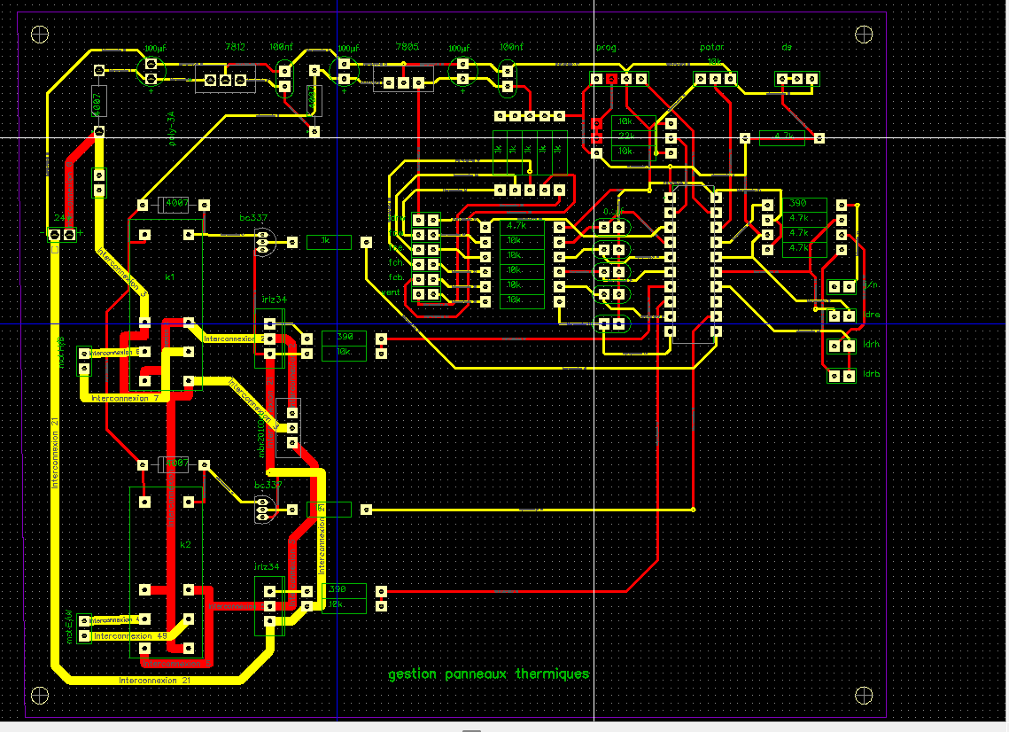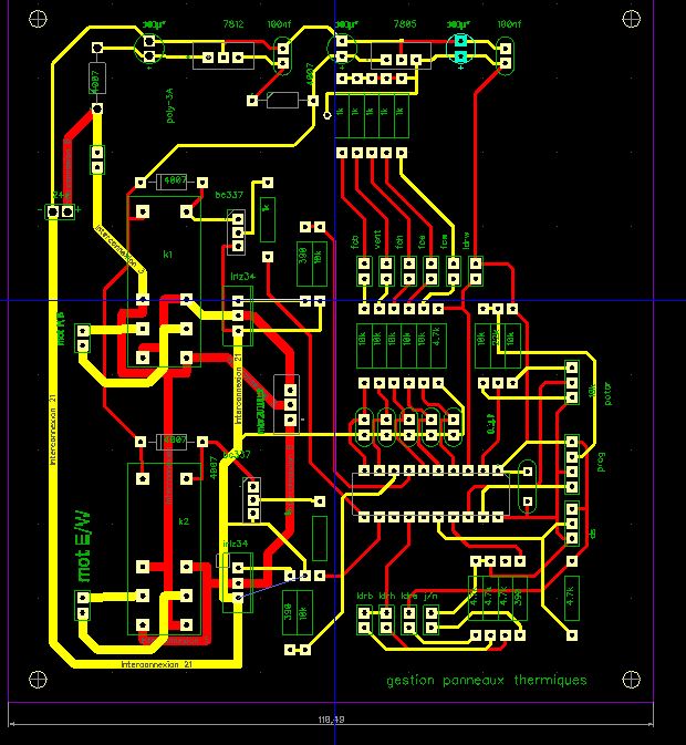 Forthorse de la place perdu certainement je n'ai pas chercher a faire réduit, il y as 6 mois que je n'ai pas fait de pcb et de toute façon ce n'est que mon 3 eme , tout ce que je sais la dessus c'est mag1 qui me l'a appris, mes 2 précédents pcb ne comportaient pas de transistors, composants pour lesquels il faut a chaque fois que je recherche l'implantation je sais implanter des picaxes et autre c'est assez simple mais les tr je ne m'y suis pas encore fait.