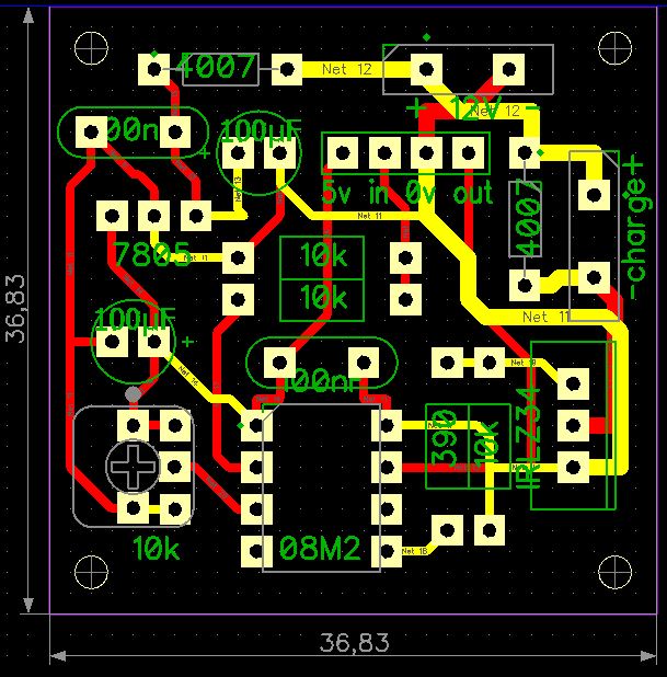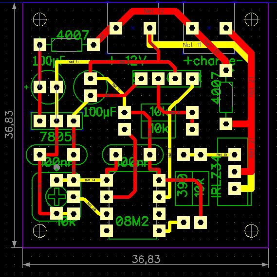Bonjour,en partant de mon schéma dip-trace j'ai fait ceci il y as encore des loupés il faut que je trouve les borniers qui correspondent mais je n'ai pas eu a faire le chevelu et je peut comparer avec le schéma, j'ai fait le placement des composants manuellement et le routage auto puis modifié
