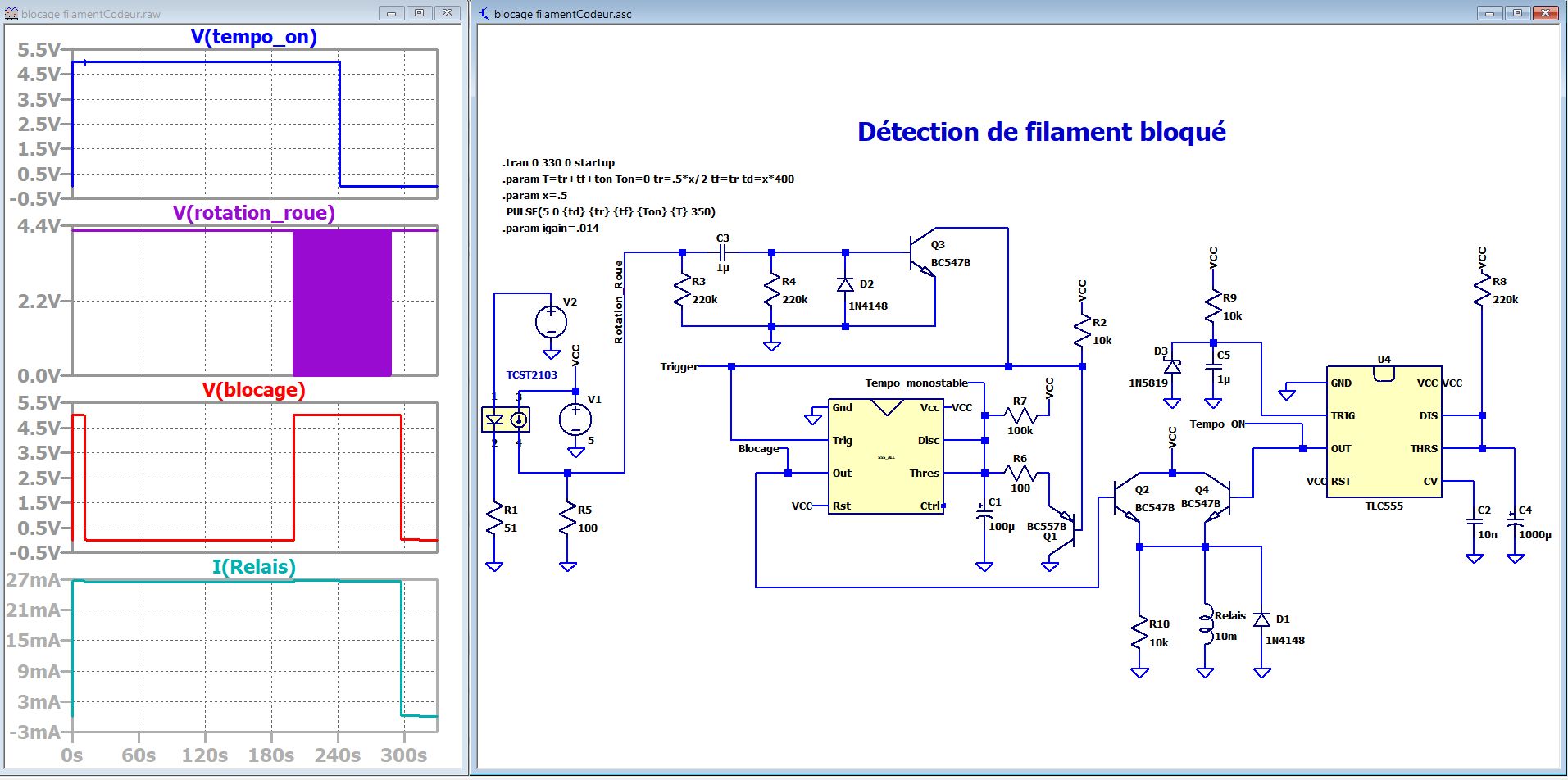 L'électronique est basée sur 2 monostables à 555, le premier en monostable réarmable par le signal issu du capteur optique et le second monostable qui est la version cmos du 555 donnant une longue temporisation (4mn sur la simulation) au démarrage de manière à s'affranchir des temps de chauffe avant que l'impression ne se lance.