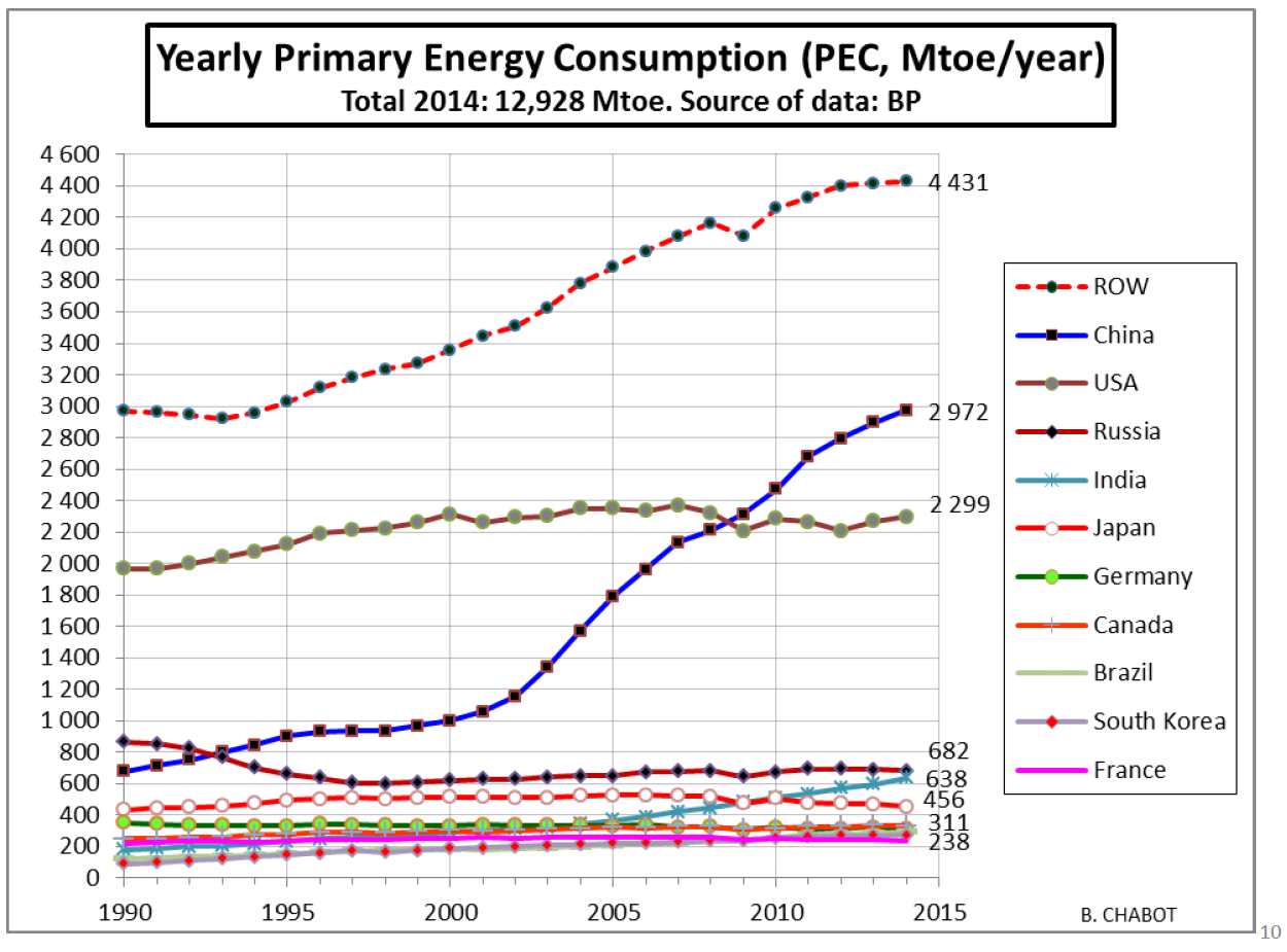 - L'enthousiasme pour la croissance des énergies renouvelables fait oublier que pendant ce temps... la consommation d'énergies fossiles croît aussi. Le résultat en valeurs absolues est que dans les pays pauvres et émergents, hors OCDE, la progression de l'électricité renouvelable est inférieure à la progression de la consommation d'électricité (IEA statistics - Key renewable trends - EXCERPT FROM RENEWABLES INFORMATION - 2015 _ http://www.iea.org/publications/free...TIIExcerpt.pdf). C'est un très mauvais signal, parce qu'il s'agit là des pays les plus peuplés, les plus émergents, les plus consommateurs, les plus croissants, bref, ceux dont dépend l'avenir de la planète.