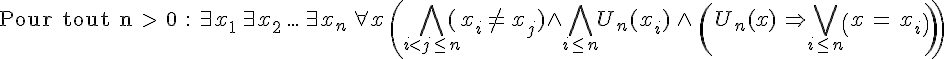 On pourrait me faire remarquer que la théorie ci-dessus n'est pas si simple que cela, puisque son langage contient une infinité de symboles de relation. Mais ce n'est pas un point essentiel, et j'aurais pu obtenir le même résultat avec un seul symbole binaire et les axiomes de la relation d'équivalence auxquels on ajoute les axiomes pour qu'il existe une et une seul classe ayant n éléments pour tout n (n > 0), mais c'est plus compliqué à écrire, à manipuler et les modèles dénombrables sont plus " compliqués " et elle n'est pas -catégorique (laissé en exercice).