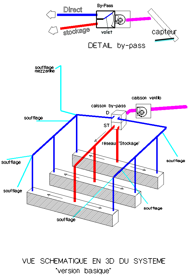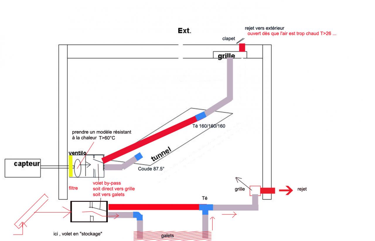 jettes un oeil sur cette vue 3D schématique de la version basique :arrivée d 'air (rouge) > caisson ventilo avec son filtre à air> caisson avec volet by-pass > sorties vers tunnel galets OU directement vers la bouche de soufflage (suivant la position du volet de by-pass )http://forums.futura-sciences.com/at...atique-3doejpg