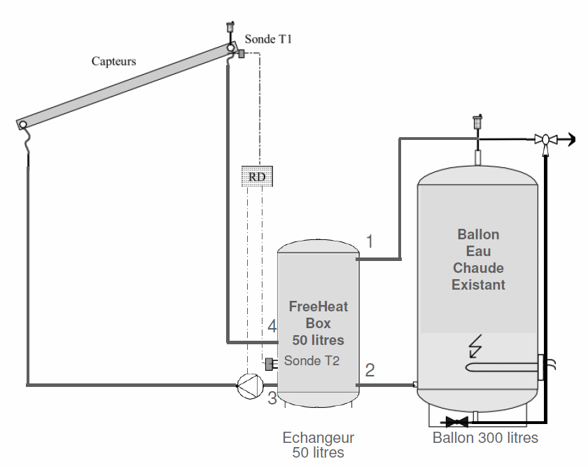 Ce qui m'etonne le plus ce sont les Té reliant d'un coté arrivée d'eau, entrée capteur et entrée ballon et le té sortie de capteur, entrée chaudiere et sortie ballon...