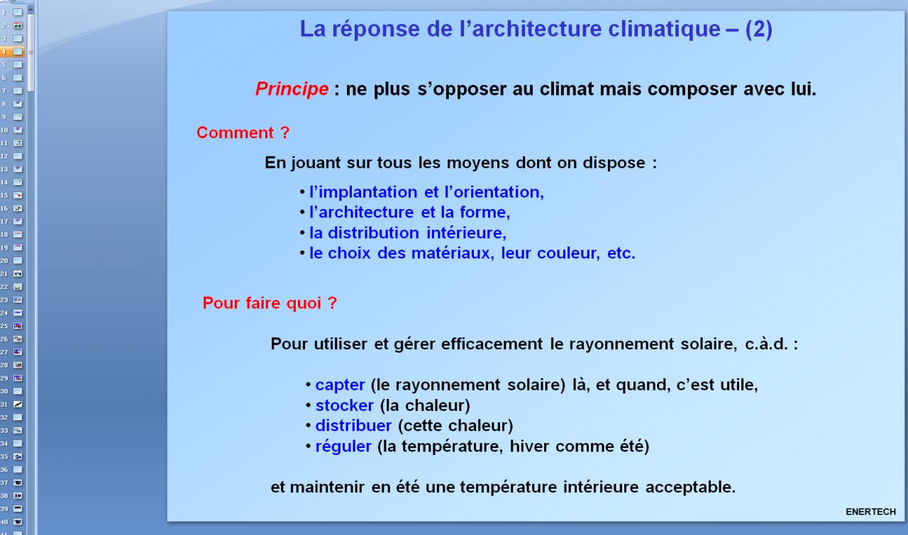 La vrai définition du bioclimatisme reside dans l'éthymologie: bio et climat, c'est tout. Le reste, ce ne sont que solutions valables dans des cas particuliers. Meme si elles sont excellentes dans un cas particulier, elles ne sont pas vérité générale.