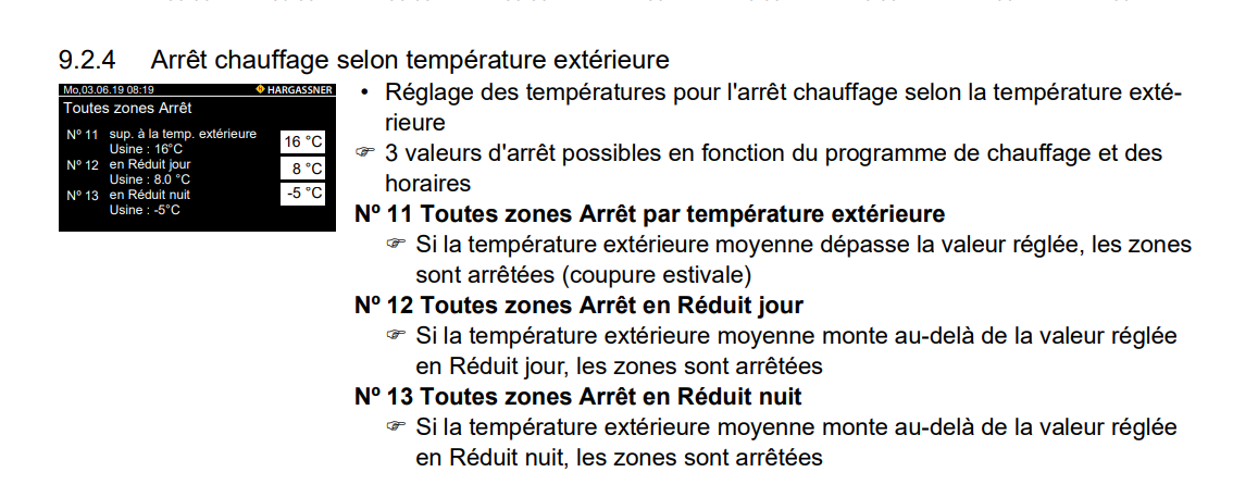 Nº 12 Toutes zones Arrêt en Réduit jour : Cela concerne le mode "Réduit" (avec la lune) hors période de nuit définie. Si la température extérieure moyenne est au-dessus de cette valeur, que le chauffage est en mode réduit, et qu'on est pas dans la période nuit (de mémoire de 22h à 6h du matin), alors le chauffage ne se lance pas, quelque soit à la consigne à atteindre.