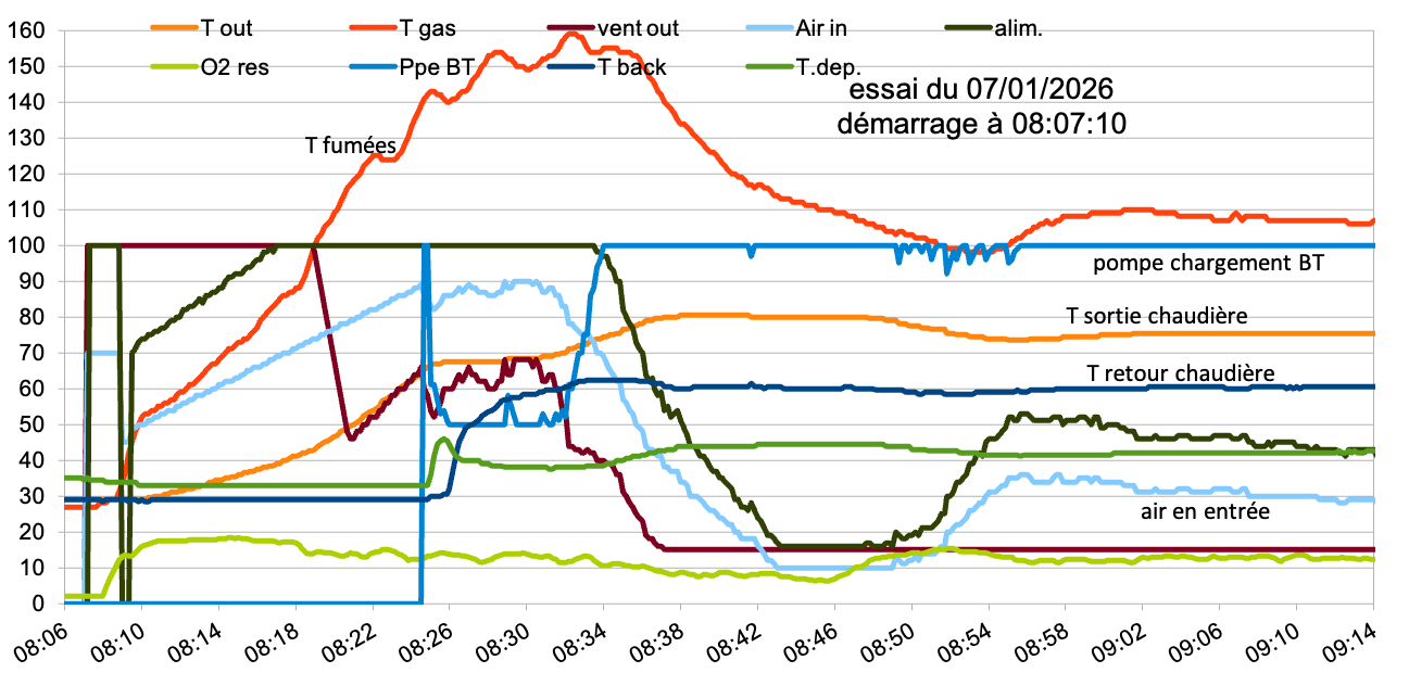 08:09:30 rampe de montée en température =alim et air in asservis linéairement à T fumées, aspir fumée=100 %; allumeur=OFF