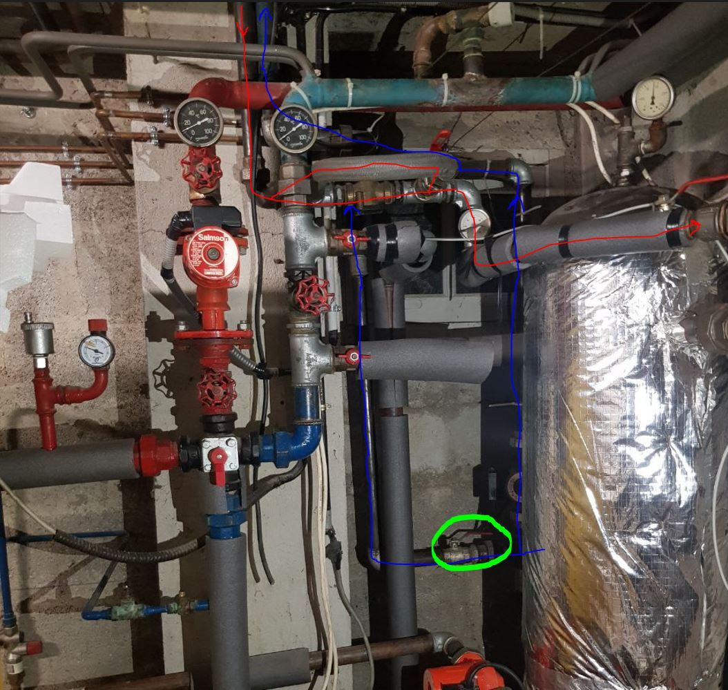 J'ai entouré en vert les emplacements de 2 vannes que j'ai ouvertes pour mettre en route l'insert bouilleur, les précédents occupants n'utilisaient que la chaudière fioul et la PAC.