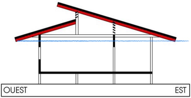- Refaire la toiture avec soit un toit plat, soit un toit incliné avec la partie la plus haute sur la façade sud (je précise qu’il s’agit plutôt de sud-ouest), soit un toit de type bioclimatique avec une pente plus haute que l’autre et une baie vitrée en hauteur laissant passer la lumière l’hiver et permettant une bonne aération.