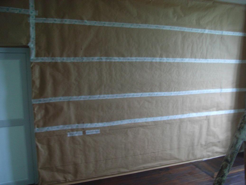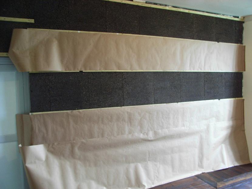 J'attends le redoux pour continuer à coller mon liège et je réfléchis en attendant. Comme mon sol n'est pas plat et que je colle le liège horizontal, j'ai des interstices de 0.5 à 4 cm entre le sol et ma première rangée de panneaux.