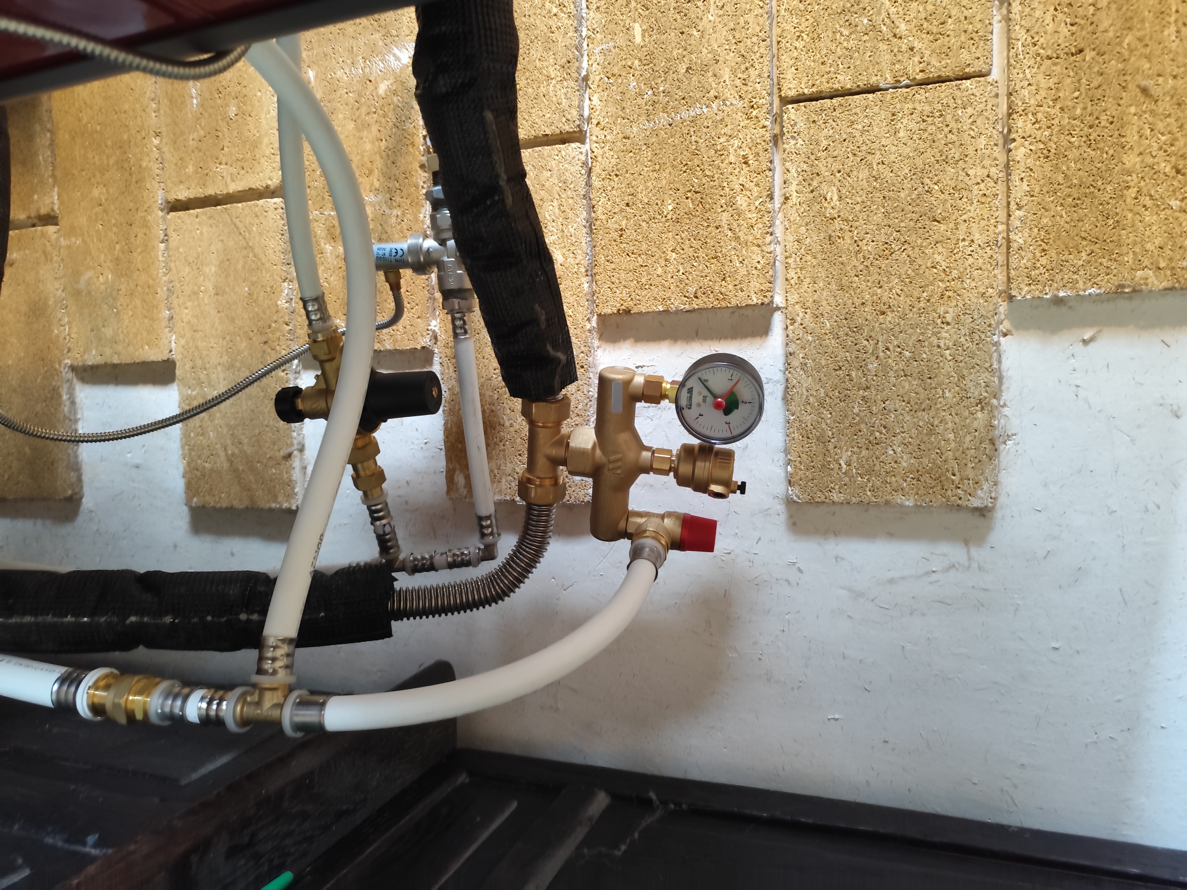 Circuit du poêle réalisé (soupape de sécurité, soupape de circuit de refroidissement, remplissage automatique)