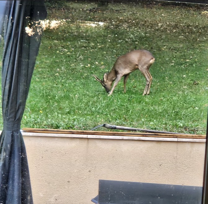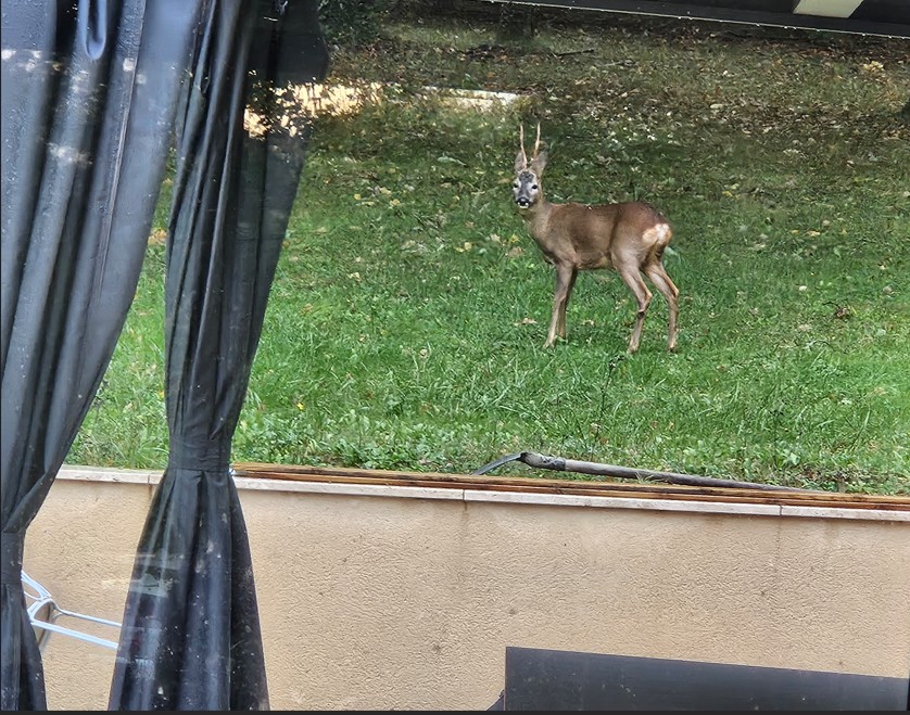 Pour bien vous prouver que le premier Casto ou Leroy n'est pas tout proche, des photos de mon plus proche voisin, prises il y a quelques semaines pendant que je faisais couler mon café. La pelle, sur le muret vous donnera une idée de la distance. Je pense l'inviter à l'apéro la prochaine fois ! (la scène a duré un bon 1/4 d'heure: pépère ne s'est pas dérangé pendant son repas !)