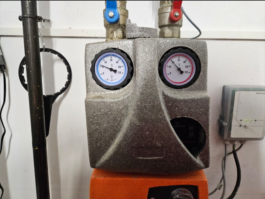 Bon, sur ce bloc circulateur habillé en polystyrène, on est censé monter la sonde de température déportée (optionnelle) de la PAC pour mesurer la T° départ PAC. et lui permettre de réguler C'est le trait vert dans l'image ci dessus. Si elle est montée dessus et qu'elle mesure la T° du plancher chauffant à la place, ça marchera pas.