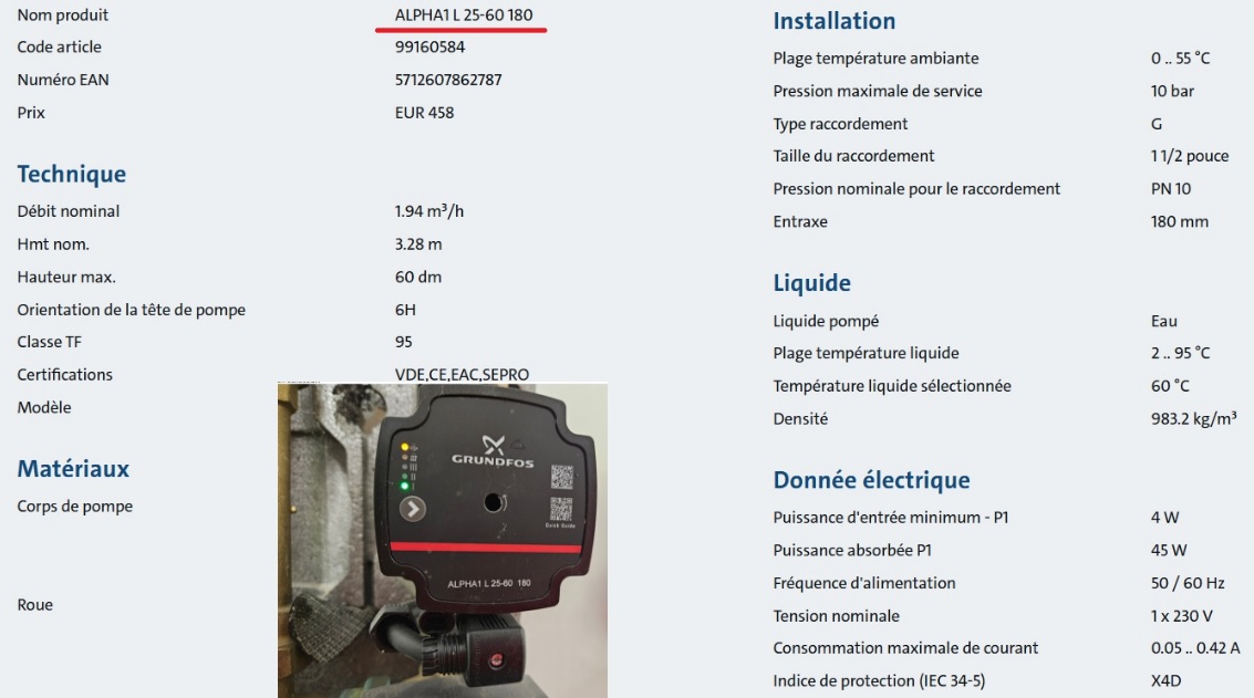 Le circulateur plancher est le Grunfoss marron / noir, et le Wilo est gris et vert