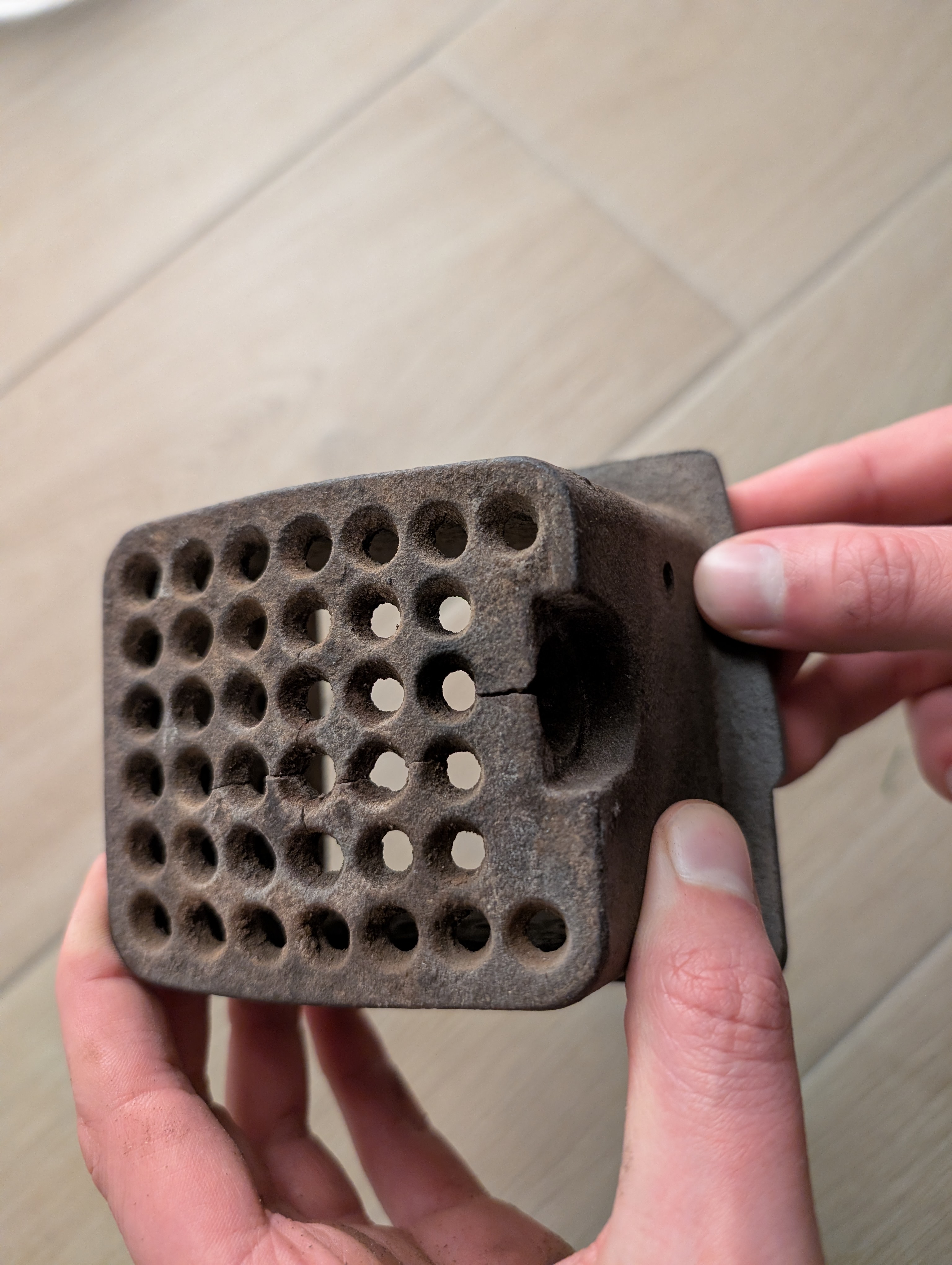 - Dernier point mon creuset était fissuré quand j'ai eu la maison et depuis c'est pire (voir photo). Il s'encrasse assez vite, avec pas mal de machefer (plus que l'hiver passé) alors que je suis sur le même stock de pellet que l'hiver passé. Cela peut-il venir du creuset fissuré justement ?