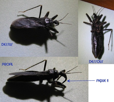 Pates rassemblée sur l'avant 3 de chaques cotés. Un trucs qui pique dans le prolongement d'une petite tête surmonté de 2 antennes. 2 ailes transparentes ternes de couleur marrons, mais n'a pas l'air d'être un super objet volant... environ 1,5 à 2 cm de long et 3 ou 4 mm de large sans les pates !!