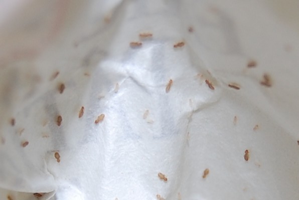 Plus nouvellement j'ai également trouvé des petites bêtes elles translucides D'environ 1 mm. J'en ai aussi trouvé d'autres noires mais de plus petite taille (moins d'1 mm) et qui paraissent toutes rondes (pas de différence entre la tête et le corps => voir photo également).