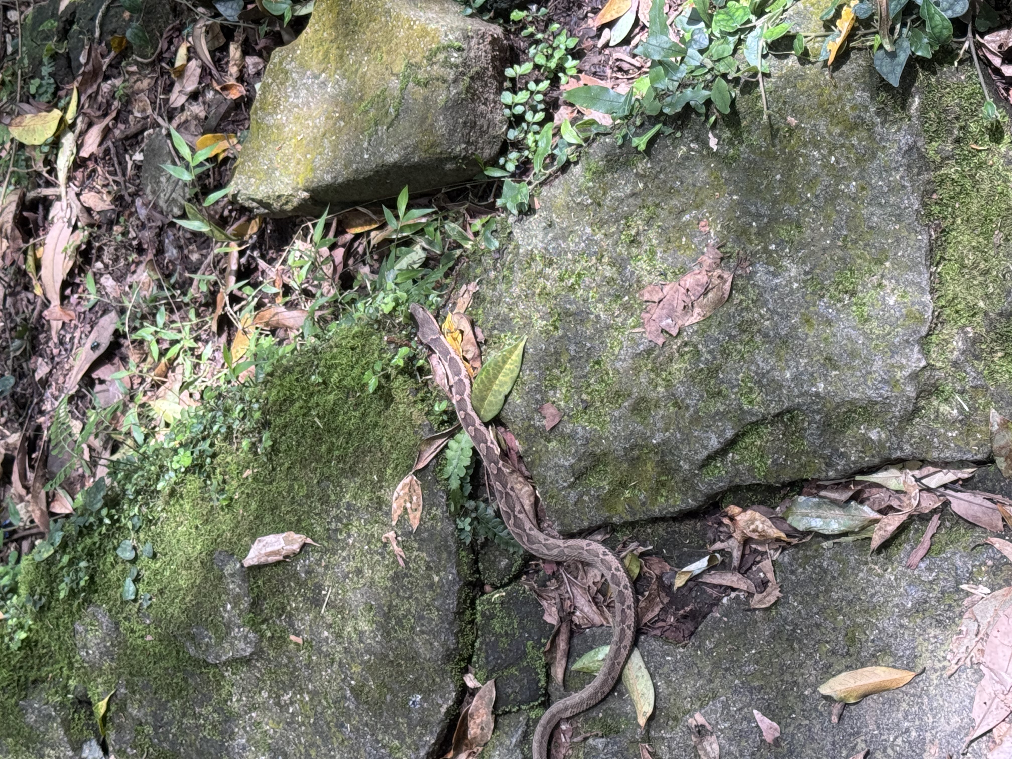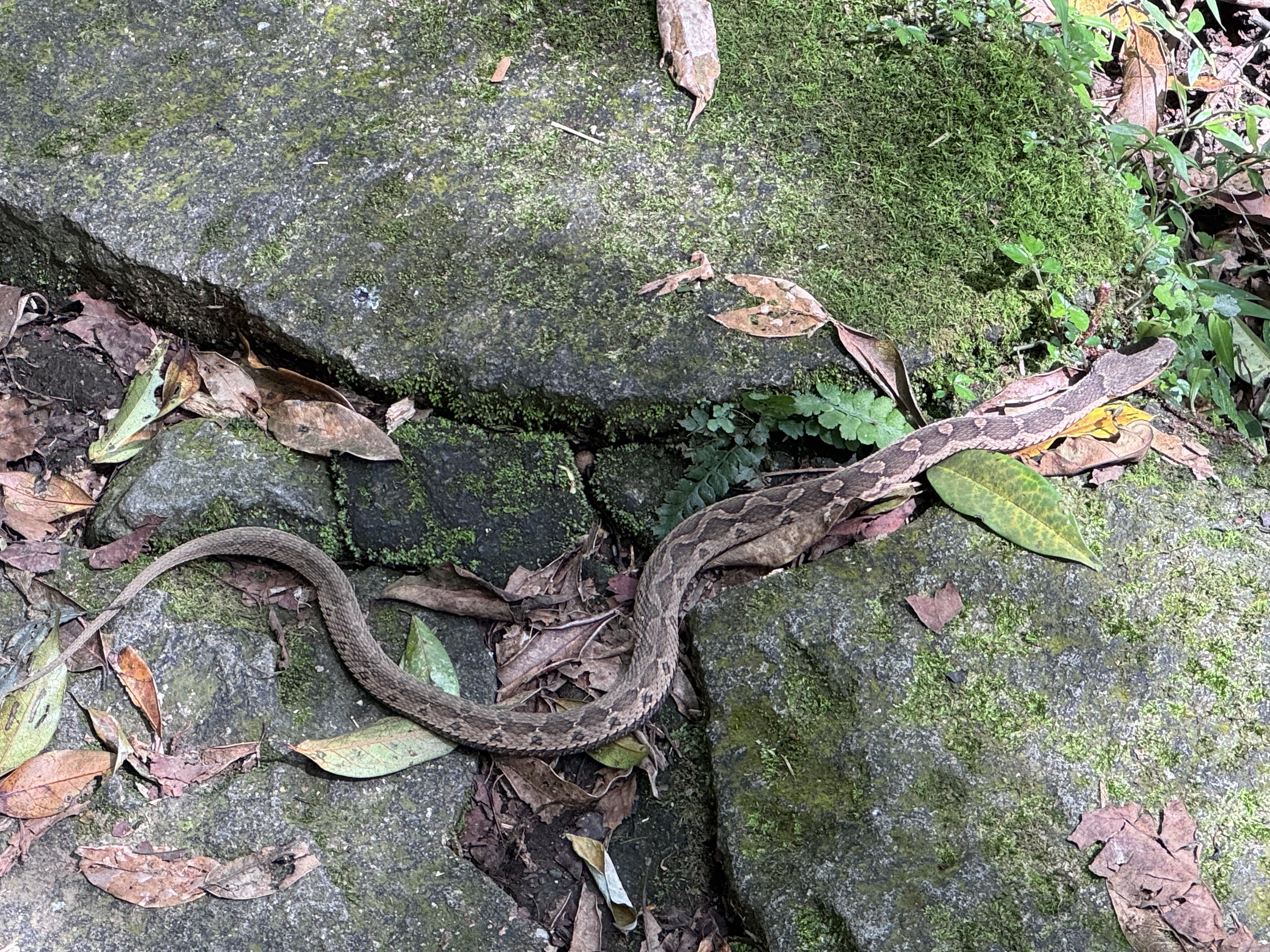 Lors d’une randonnée à Taïwan dans le secteur de la cascade Juansi (parc de Yangmingshan) j’ai croisé ce serpent. Le secteur est arboré, très humide et plutôt de type «*tropical*». Je n’ai malheureusement pas pensé à prendre une photo de ses yeux, et la qualité laisse à désirer puisqu’il s’est enfui assez rapidement… Est-ce quand même suffisant pour identifier l’animal ? Après quelques recherches j’hésite avec la Vipère des cent pas (Deinagkistrodon acutus), la fausse vipère (Pseudagkistrodon), et la vipère à taches brunes (Protobothrops mucrosquamatus).