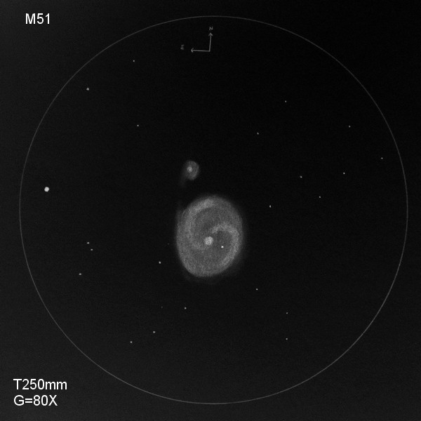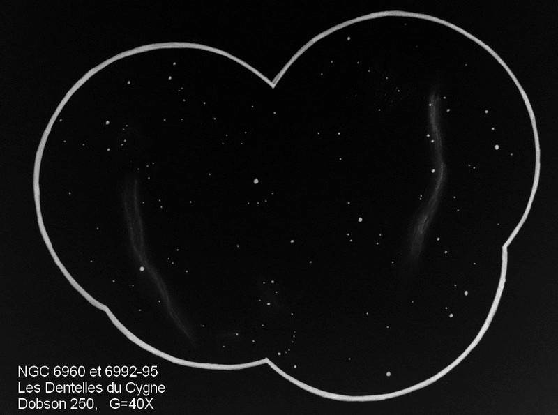 Je vous propose aujourd'hui deux modestes dessins. Le premier, une "mosaique" de la région des dentelles du cygne que j'ai souvent l'occasion d'observer avec mon filtre UHC, mais comme elle ne rentre pas toutes les deux dans l'oculaire, j'ai decider de dessiner la totalité de cette region. Ensuite, M51 la galaxie du Tourbillon dans le chien de chasse, sur ce dessin j'ai avant tout grossit volontairement l'objet et accentuer chaques détails, il est clair que dans un T300, les bras spiraux se font timides... mais c'est un objet qui me rend fou