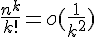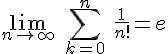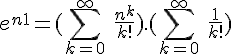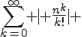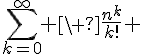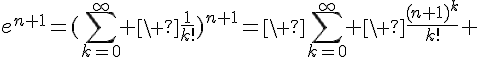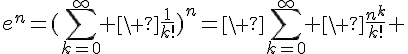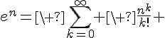 En conclusion , par critere de comparaison avec une serie de Riemann divergente, \sum_{k=0}^\infty \ \frac{n^k}{k!} [/TEX] converge absolument.
