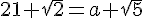 Bonjour, Je dois mettre l'expression 21 * racine(2) - 44 sous la forme a * racine(5) + b En posant , tu peux déjà déterminer a et retrouver le résultat de MMu. Ensuite tu peux déterminer b facilement.