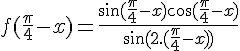 Bonjour, je suis en 1ere S et j'ai un DM avec un exercice qui me bloque...faut que je fasse l'étude d'une fonction qui est : f(x)=(sinx+cosx)/sin2x , on me demande de montrer que elle admet comme axe de symétrie une droite d'équation x=PI/4 puis je dois prouver l'existence de centres de symétrie dans l'intervalle ]-PI ; 5PI/2[