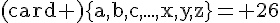 1) "_Attention : nombre cardinal = 26 de l'Ensemble "abc" des lettres de l'alphabet (machin) c'est dire : card "abc"= 26 avec "abc"={a,b,c,...,x,y,z}"