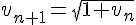 Bonjour, j'ai un problème : je n'arrive pas à trouver la relation de récurrance qui lit la suite (vn) et (vn+1) : vn=racine(1+racine(1+racine(1+ racine(1...etc)))) Merci de m'aider