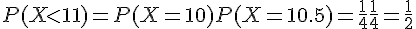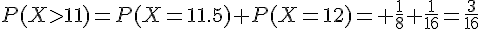 D'après l'arbre (X=11)=(V∩R)U(O∩V)U(R∩R) donc P(X=11)=P(V∩R)+P(O∩V)+P(R∩R)=1/2*1/4+1/4*1/2+1/4*1/4=5/16