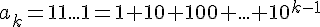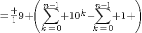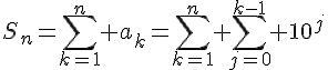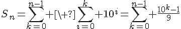 Voici l'énoncé "Le but de cet exercice est de calculer la somme : Sn = 1 + 11 + 111 + 1111 + ... + 111... 1 (n chiffres 1). En multipliant la somme Sn par 9 et en remarquant que 999...9 (n chiffres 9) = 10n - 1, démontrer que : Sn = [10n+1 - 9(n+1) - 1]/81."