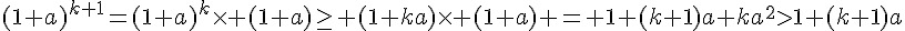Puis, pour l'hérédité... j'ai dit que l'on admettait qu'elle était vraie pour n = k et que l'on devait à présent démontrer qu'elle l'était aussi pour n = k + 1 donc pour (1 + a)k+1 supérieur ou égal à 1 + (k+1)a.