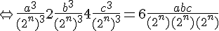 Cliquez pour affichertu te ramènes au cas des entiers, tu divises par le cube de leur PGCD, on obtient donc une équation où l'on peut supposer que a,b et c n'ont aucun facteur supérieur à 1 en commun, puis tu montres successivement que a est pair, puis que b est pair, puis que c est pair. Ceci contredit le fait qu'ils n'aient aucun facteur en commun.