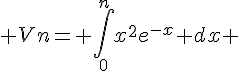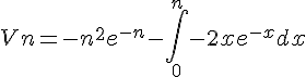 Ok. Ensuite on me donne Je dois prouver que c'est égal à Avec Vn, je prend u=x² et u'=2x v'= e^(-x) et v=-e^(-x) Je trouve Je refais une intégration par parties: u=-2x et v'= e^(-x) u'=-2 v -e^(-x) J'ai Ce qui ne correspond pas tout à fait ave ce qui est demandé. Vous pourriez m'aider à trouver mes erreurs svp? =)