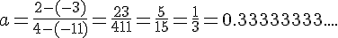 Ensuite la pente, donc "a", se calcule à partir de 2 points de la droite, par exemple A et BLa coordonnée x de A est 2, la coordonnée y de A est 4. La coordonnée x de B est -3, la coordonnée y de B est -11. La pente, c'est une fraction où le numérateur, c'est la différente des "y" des deux points, et le dénominateur, c'est la différence des "x" des deux points. Autrement dit:
