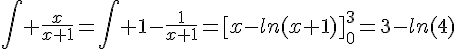 [(ln(1+x))*x]de 0a3 - intégrale de 0 a 3 de ((1/(1+x))*x) dx