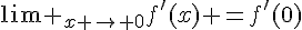 La quantitéadmet une limite finie lorsque h tend vers 0 (par valeur positives puisqu'il ne peut tendre vers 0 que par valeurs positives), nous appelons cette limite "nombre dérivée à f en 0" et nous la notons f'(0), on dit de plus que f est dérivable en 0.