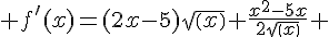 Comme f est dérivable en 0 et sur tous les réels strictement positifs, alors f est dérivable sur tous les réels positifs (plus de strictement ^^) et on peut définir la fonction dérivée à f qu'on note f' et qui associe à tout points le nombre dérivée à f en ce point.