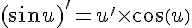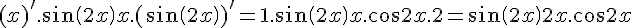 Et cela ne suffit toujours pas, car on vient de dériver v(u(x)) et non pas v(x) — i.e sin(2x) et non pas sin(x). Il faut donc à nouveau multiplier le résultat par la dérivée de ce qu'il y a dans les parenthèses de v(...), soit: