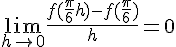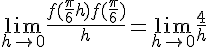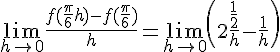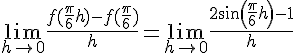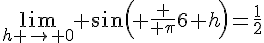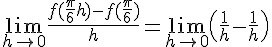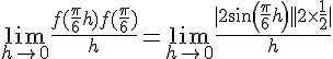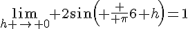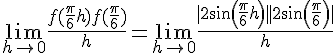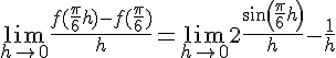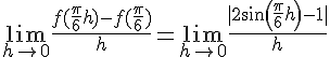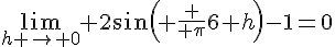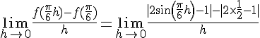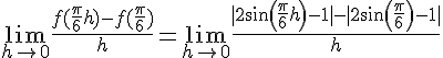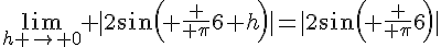 et j'obtiens finalement lim h->0 |2.sin(pi/6 + h) -1| / h, ce qui me donne 0/0. Mais je n'arrive pas à factoriser pour lever l'indétermination...