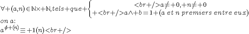 Je me demandais s'il était possible d'en avoir une démonstration "classique" du niveau de terminale (plutôt courte ^^, mais je n'ai pas peur des longues démo.) L'exo en question m'amène à une démo (que je posterai ce soir, là je n'ai plus le temps, dsl) un peu longue et utilisant l'ensemble des nombres inversibles mod(n).