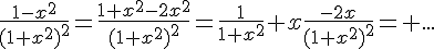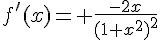 Mais voilà, si ansset ne m'aurait pas donné la primitive de -2x/(1+x^2)^2, eh bien j'aurai pas trouvé ! Je ne sais pas primitiver les fractions ! Mis à part primitiver 1/(1+x^2)^2, ce qui donne arctan(x), Eh bien je ne sais pas comment on procède !