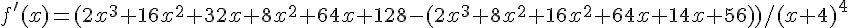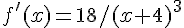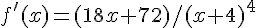 f '(x)= 18/ (x+4)^3 or je trouve f '(x)= ( 18x+72)/(x+4)^4 je sais que ces équations sont égales mais je ne sais pas comment le démonter...